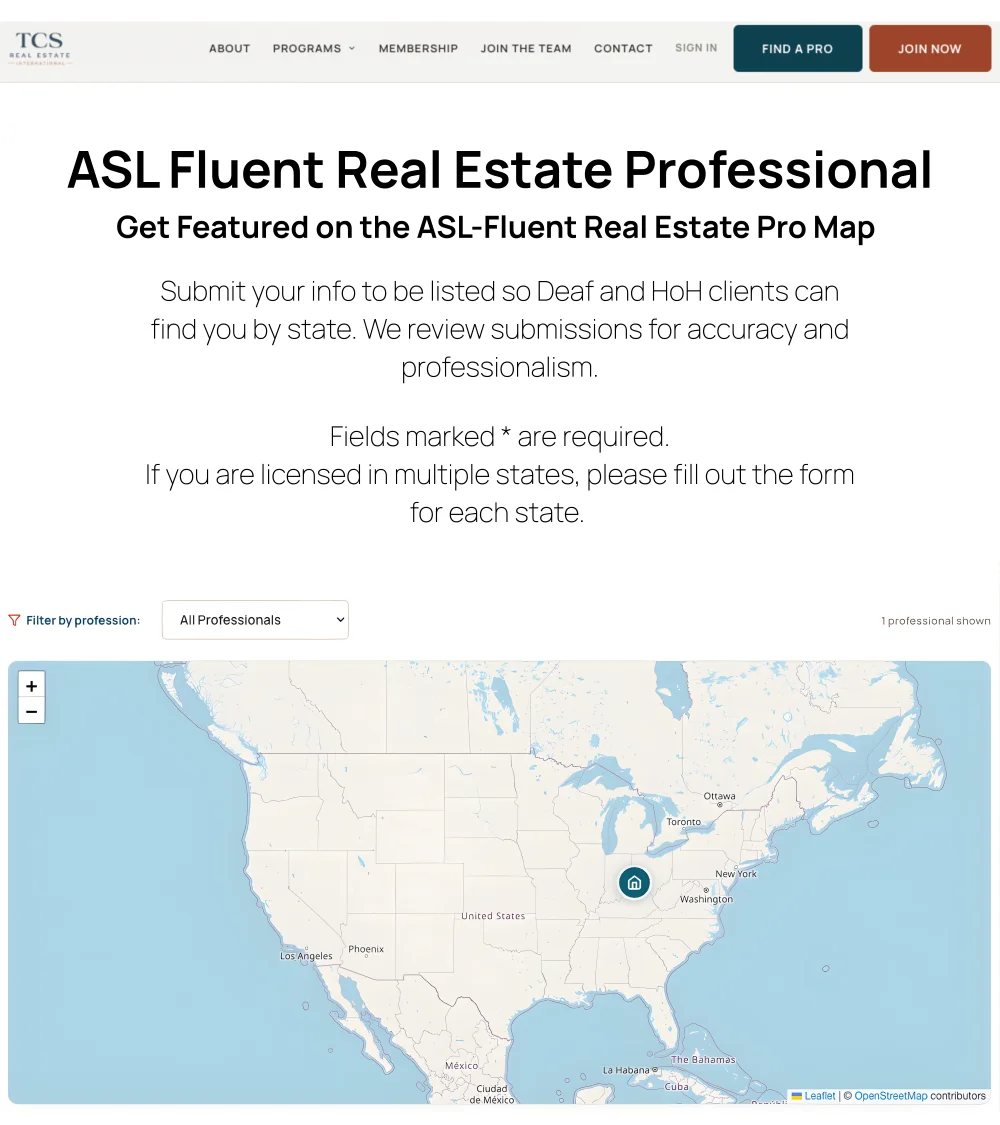 By checking this box, you’re okay with receiving helpful, non marketing text updates from TCS Real Estate International about your request to be featured on the ASL Fluent Pro Map. Message frequency varies. Message & data rates may apply. Reply STOP to opt out or HELP for assistance.
