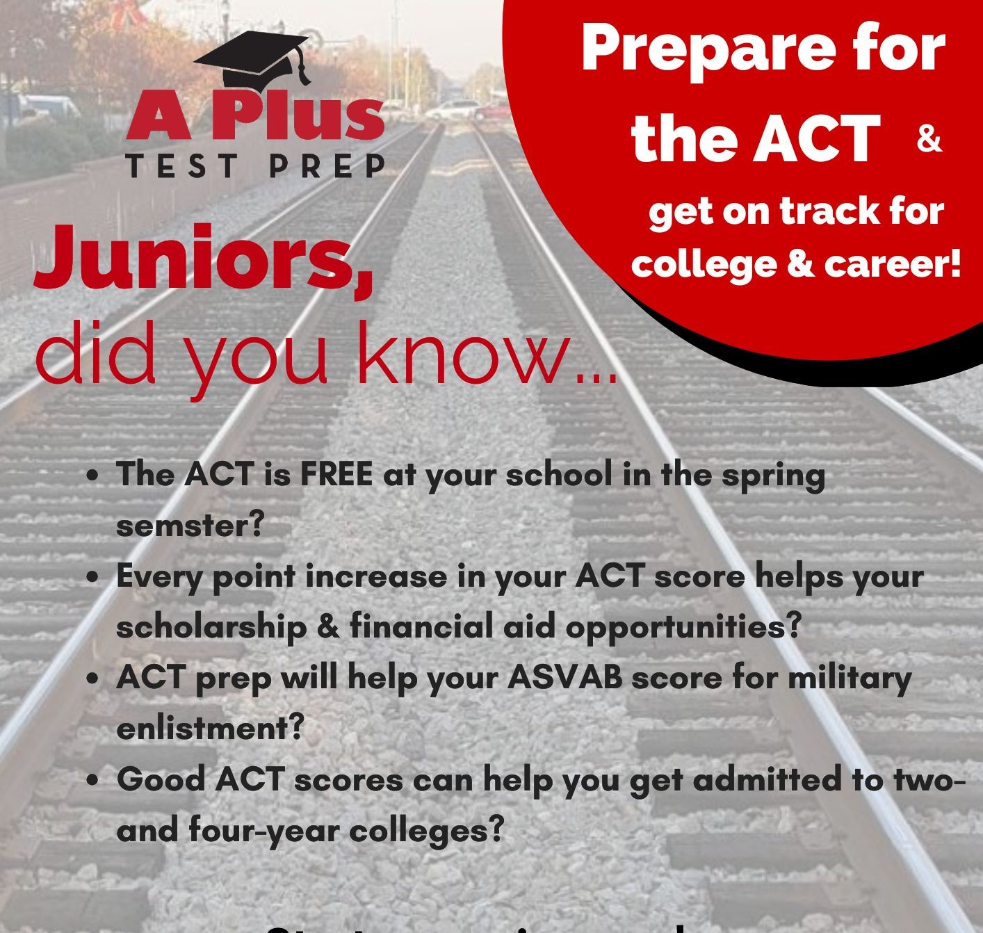 Parents and students, you're invited to participate in "Stay on Track for the ACT." We'll send encouragement along the way up until your test date: practice questions, motivating moments, practical tips, and more. We won't overwhelm you; we simply want to help you "stay on track for the ACT."