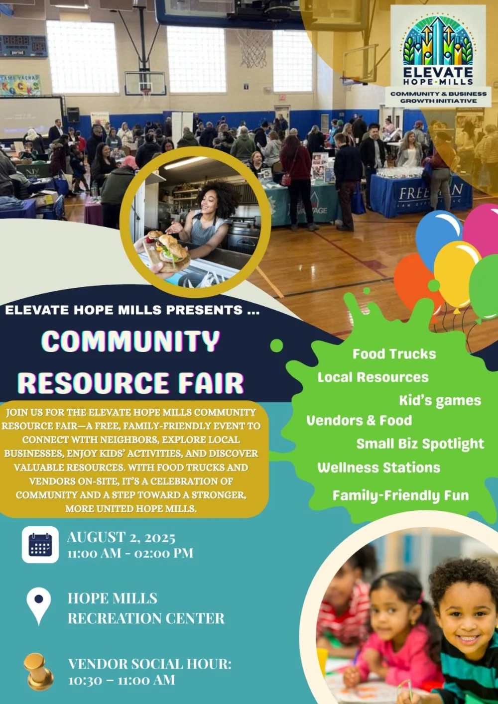 Thank you so much for your interest in being part of the Elevate Hope Mills Community Resource Fair. We are truly grateful for the overwhelming response and support from local businesses and organizations — our vendor spots are now officially full.