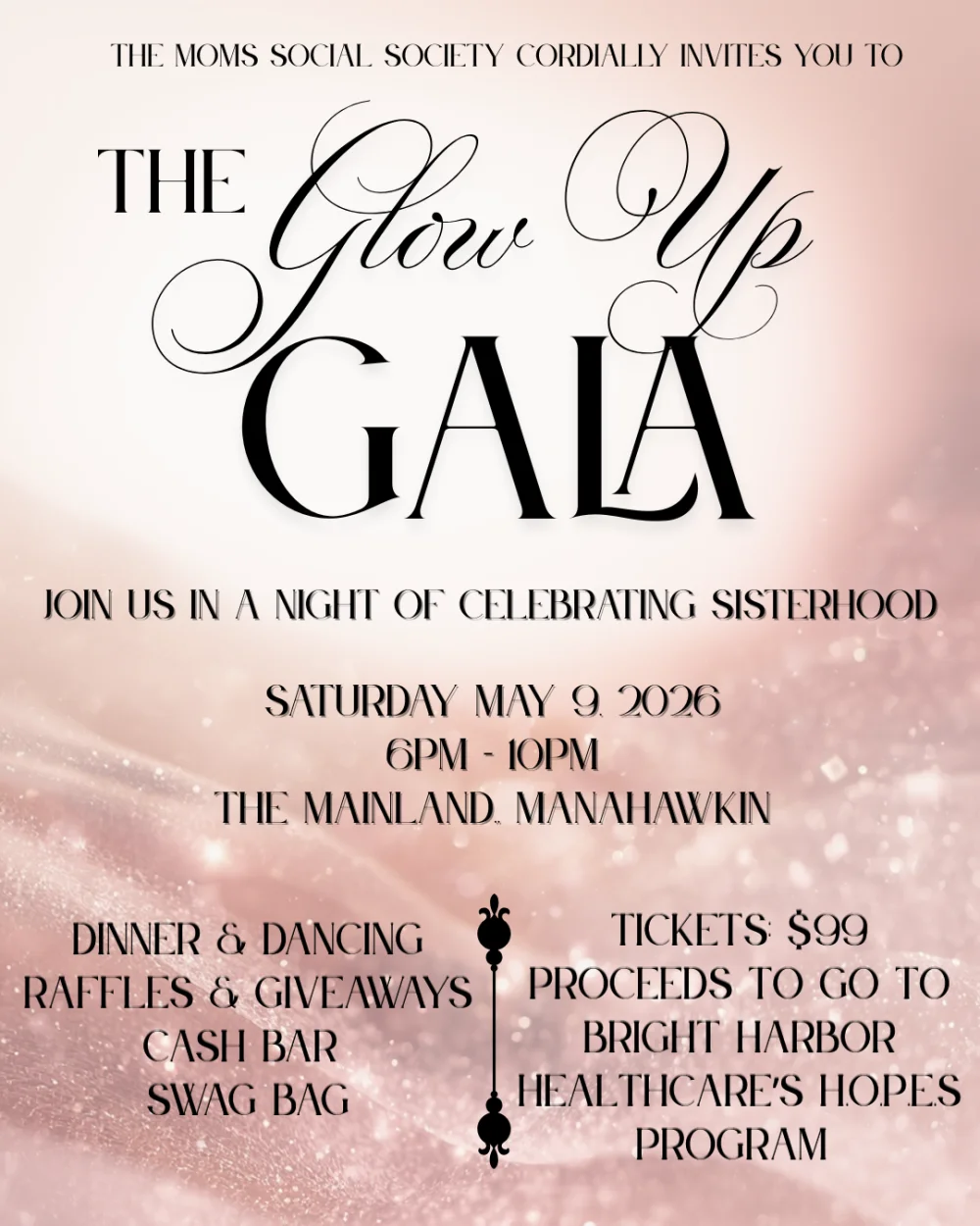 The Glow Up Gala is happening Saturday, May 9th from 6–10PM at The Mainland — and I want you there with me.