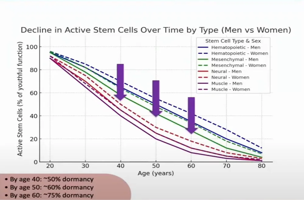 As we age, our body's active stem cells naturally decline, which impacts our ability to regenerate and maintain optimal health: