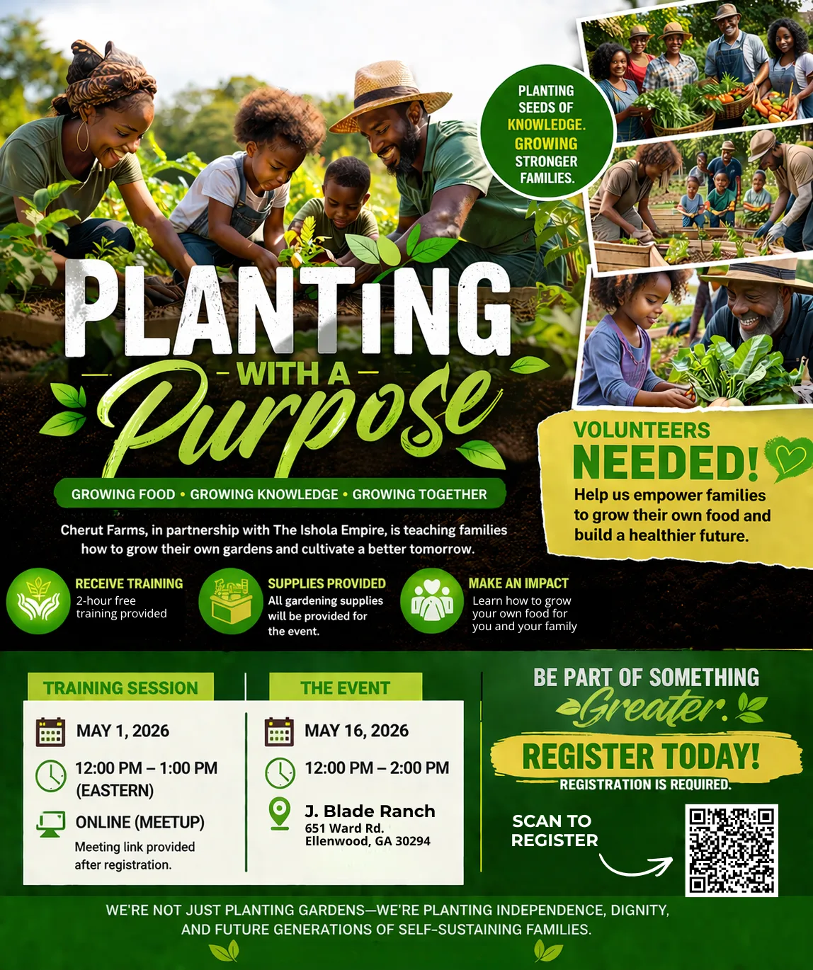 Cherut Farms, in partnership with The Ishola Empire, J Blade Ranch, and the Center for Truth and Healing (CFTH) invites you and your family into a transformative, hands-on experience rooted in land, legacy, and self-sufficiency.