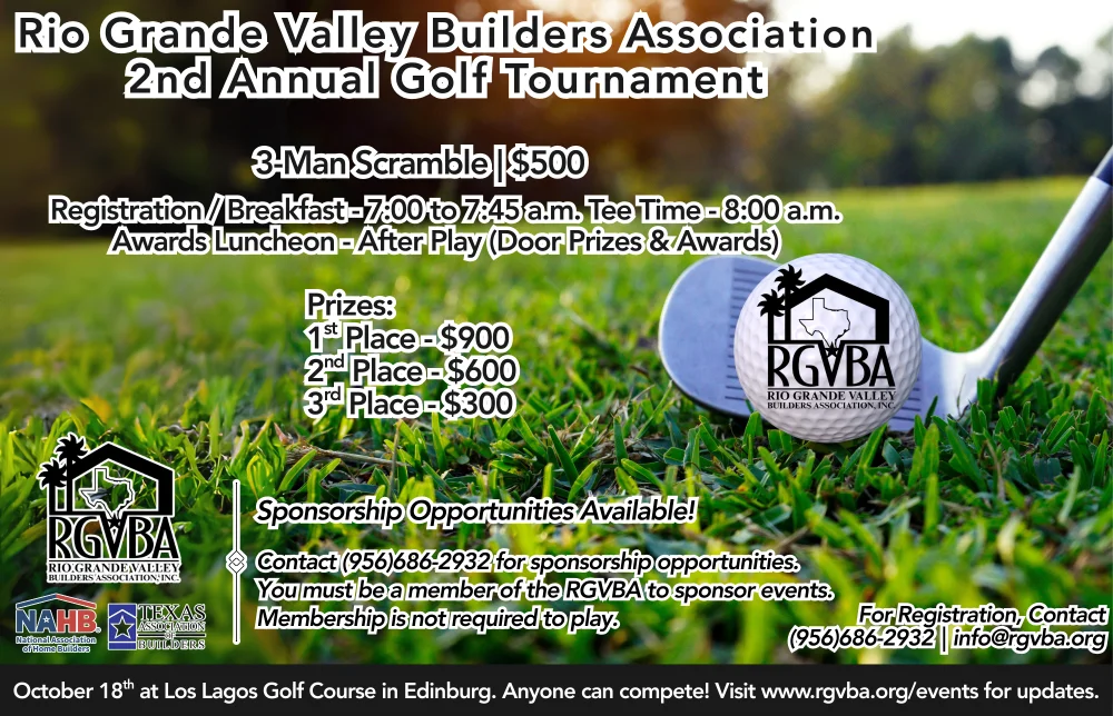 Thank you for your interest in participating in the Rio Grande Valley Builders Association's 2nd Annual Golf Tournament, taking place on Saturday, October 18th at Los Lagos Golf Course in Edinburg. Registration / Breakfast will run from 7:00 AM to 7:45 AM. Tee Time will begin at 8:00 AM. The Awards Luncheon will begin after play with door prizes and awards. Please carefully read and respond to all fields on this form to submit your team registration for the 2nd Annual Golf Tournament. You don't have to be a member to play, but please visit our membership sign-up page if you are interested in becoming a member of the RGVBA to take advantage of future member-exclusive events.