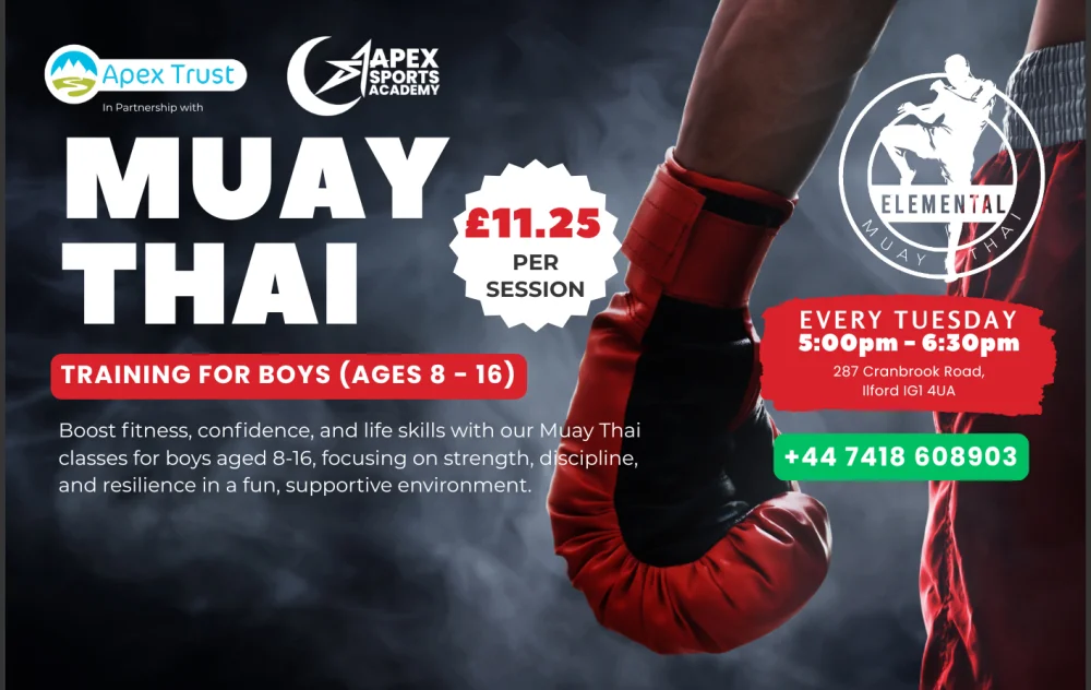 Participation in Muay Thai training involves physical activity and carries the risk of injury. By enrolling your child, you acknowledge that you are aware of these risks and that you voluntarily assume full responsibility for any injury that may occur. You agree to release the trainers, instructors, Apex Trust, Elemental Muay Thai, and the venue at 287 Cranbrook Road, Ilford, IG1 4UA from any liability for injuries sustained during class or training sessions in the case of non fault.