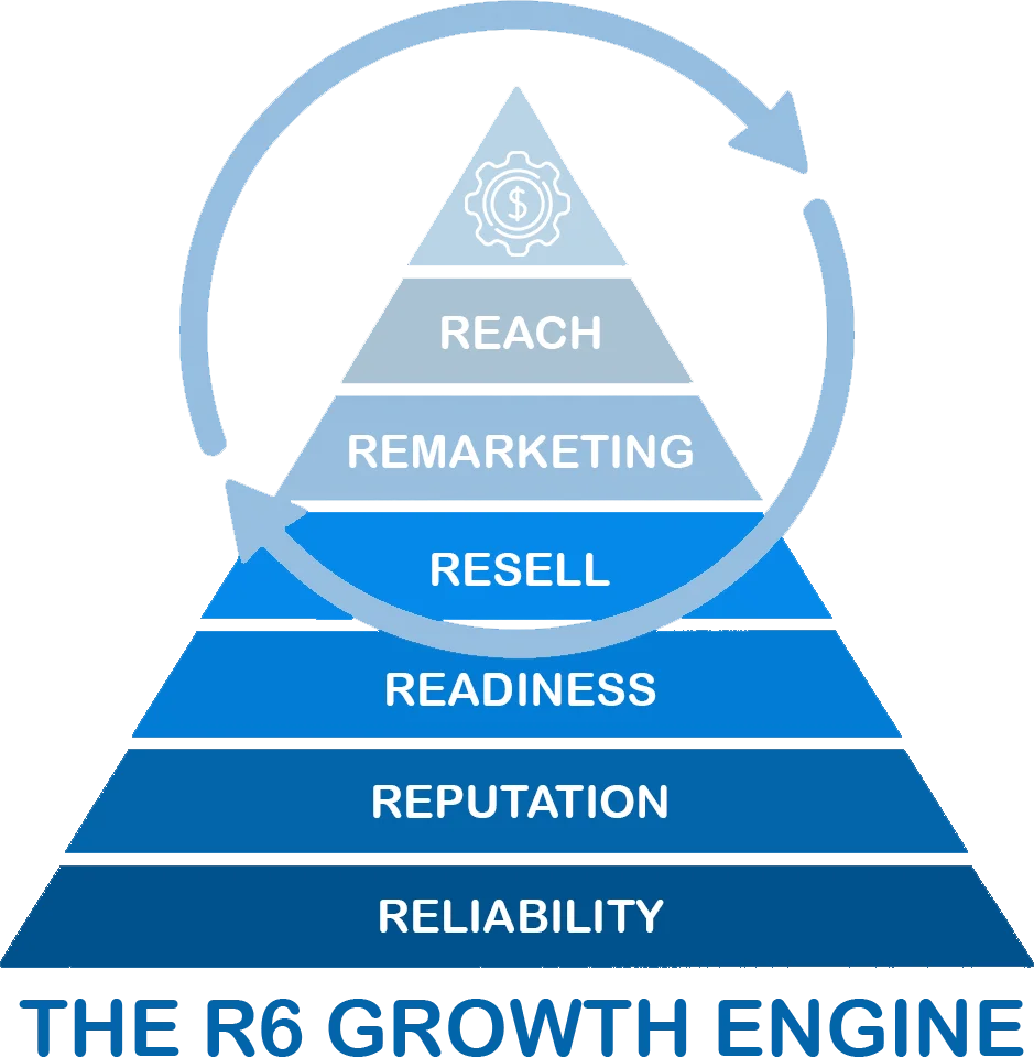 Our FREE foundational R6 Growth Engine Audit ($149 value) will help you better evaluate how your business is performing in the first 4 core R6 cylinders critical for small business growth (Reliability, Reputation, Readiness, and Resell); which of your related business systems may benefit from a tune-up; and give actionable steps to address any deficiencies identified. To gain the maximum benefit possible, we encourage you to provide an honest and thorough evaluation of your business.