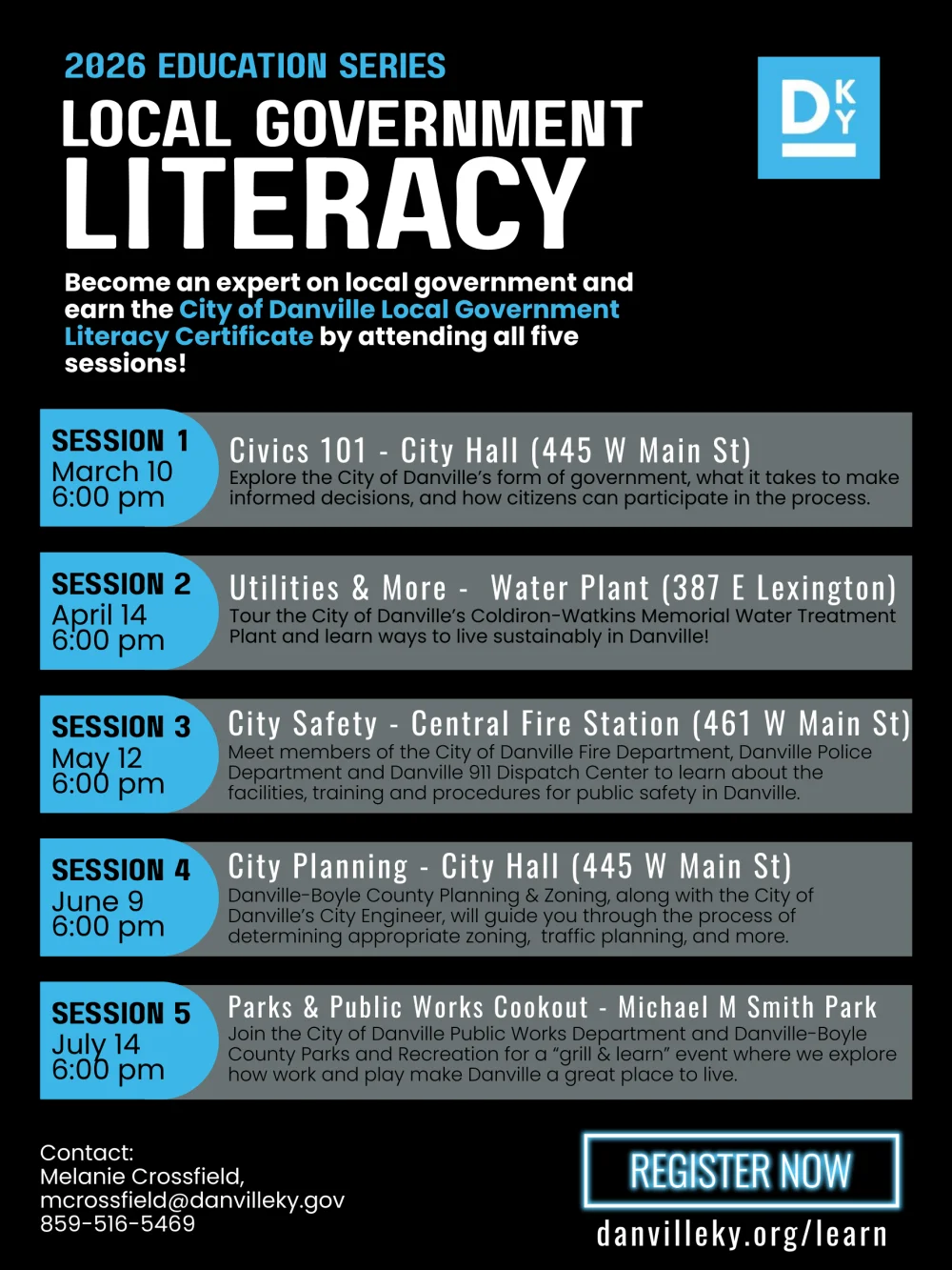 A five-session program for civic-minded citizens. Earn your City of Danville Local Government Literacy Certificate by attending all five sessions! Refreshments provided