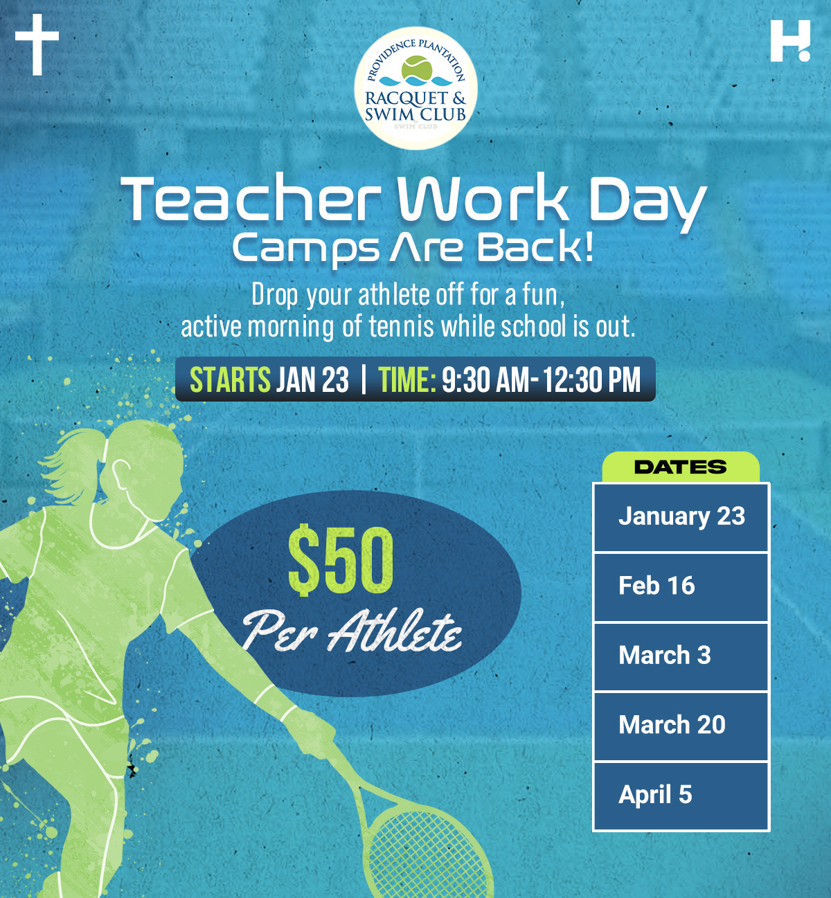 Register them for a Teacher Work Day Camp – a fun, structured and energized day of tennis, exercise and learning! This is a great opportunity to keep your athlete busy on an off day and for them to sneak in a little extra practice while others might not be!