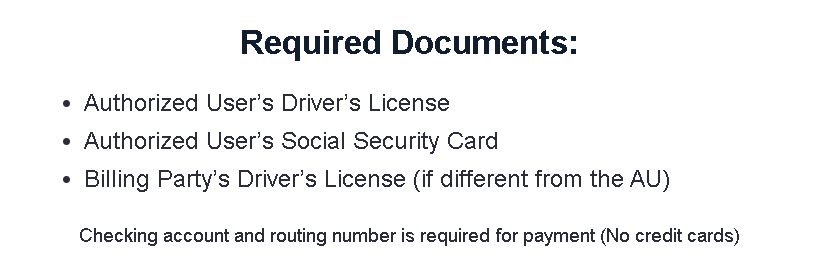 We must have all required documents to proceed with your authorized user tradelines. Tradelines are time sensitive and missing documents could cause a delay in your requested purchase