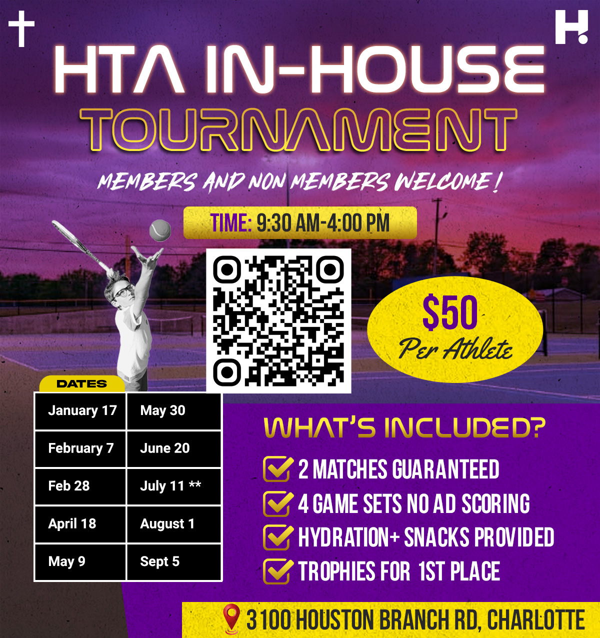 The HTA In-House Tournament is your athlete’s chance to experience true competitive tennis in a familiar, supportive, and professionally-run environment. Designed for ages 8+, this event gives players the thrill of real match play with proper scoring, roaming referees, and a structured draw—without the travel, cost, or intimidation of USTA/UTR events. Each athlete receives two guaranteed matches, featuring 4-game sets with no-ad scoring, making it the perfect format to build confidence, resilience, and competitive IQ. Winners advance, first-round losses move to a consolation draw, and all matches are managed by HTA staff to ensure fairness and a positive environment. Athletes must know how to keep score independently, as no parental coaching or communication is permitted during competition. Trophies are awarded for 1st Place, and both members and non-members are welcome to join. Register now to secure your athlete’s spot in this month’s HTA In-House Tournament!