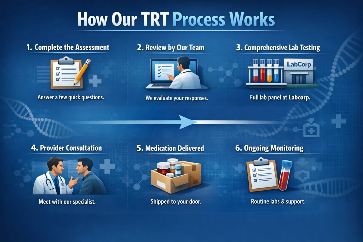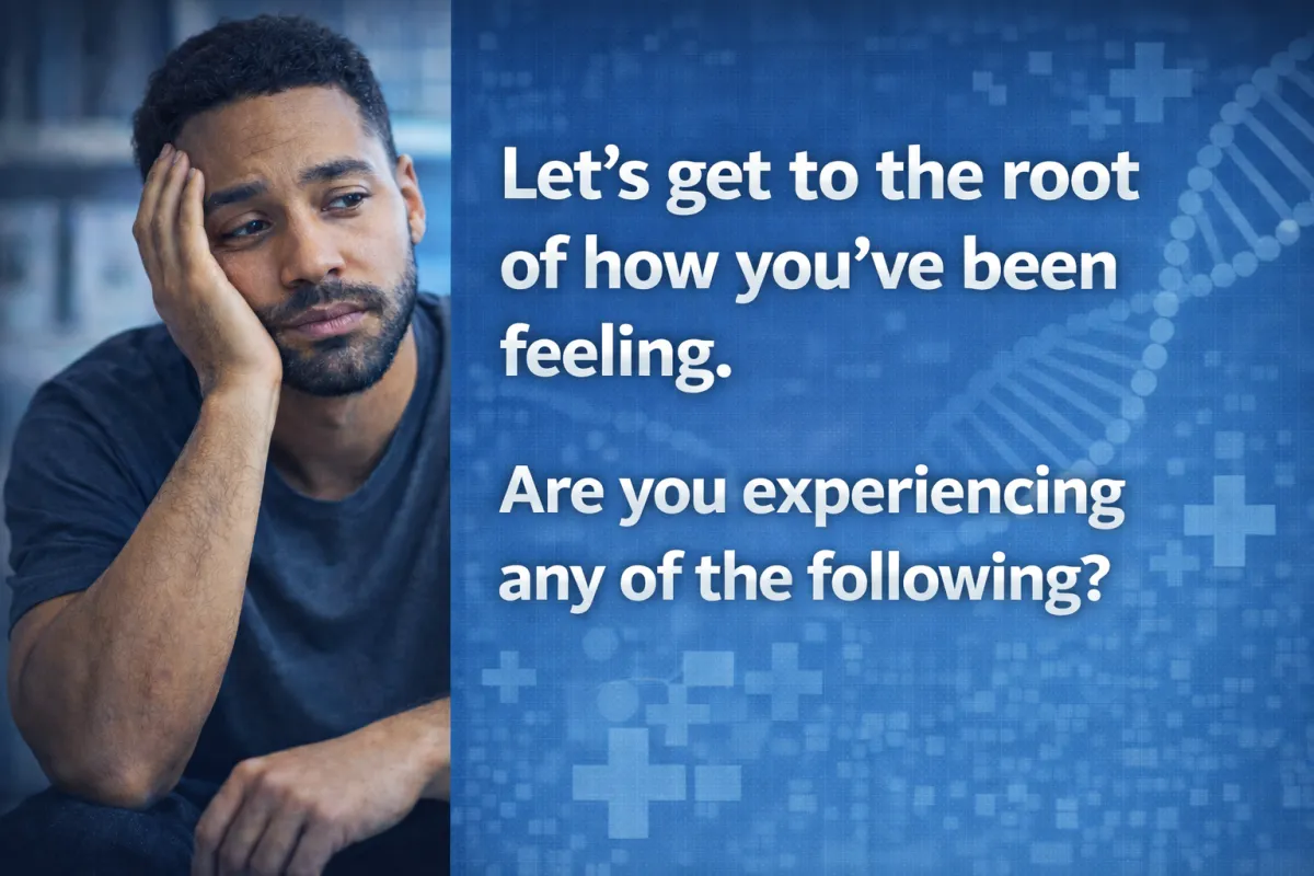 This quick assessment is designed to help determine whether you may be a candidate for testosterone replacement therapy (TRT). You’ll be asked a series of questions about your symptoms, lifestyle, and overall health. It takes less than 2 minutes to complete, and your responses will help our medical team better understand your needs before your consultation.